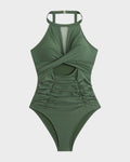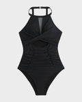 Round Neck Cut-Out Mesh Panel Ruched Swimsuit